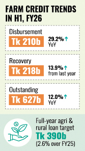 Agricultural loan activities in Bangladesh have seen significant growth in the first half of the FY 2025-26, with disbursement rising nearly 30 per cent and recoveries also climbing, pushing outstanding farm loans to over Tk 627 billion, official data shows.