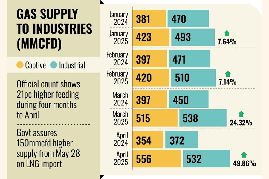 Gas feeding to industries increased 21 per cent year on year during the past four months to April, official data showed Monday, amid industrialists' urge for adequate fuel to run factories.