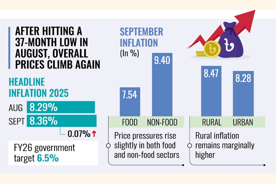 The rate of inflation on a point-to-point basis in Bangladesh was recorded at 8.36 per cent in September, 0.07-percentage-points higher than 8.29 per cent in August, Bangladesh Bureau of Statistics (BBS) showed in its report on Monday.