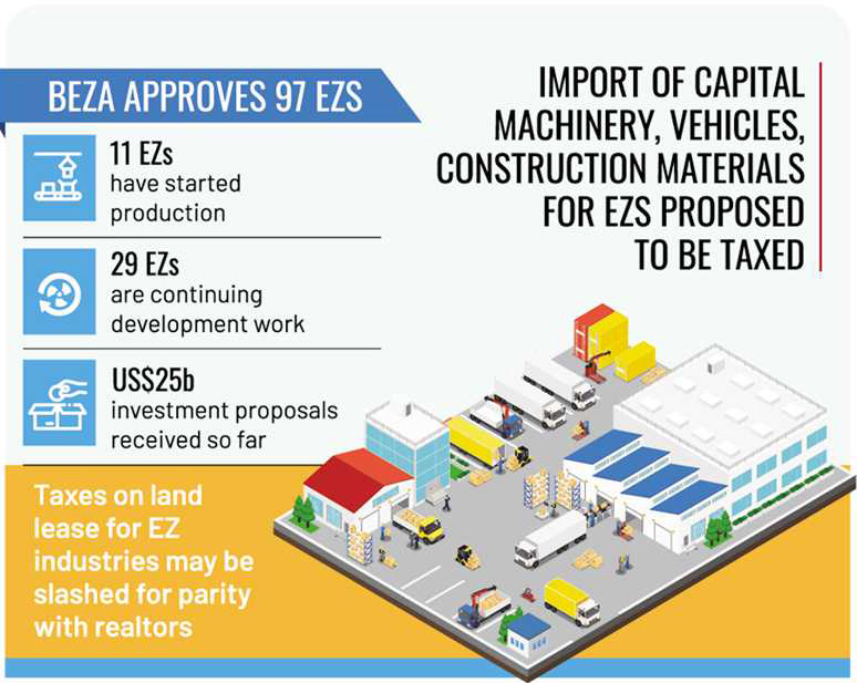 The BEZA governing board has approved the setting up of 97 EZs. Of them, 38 industries in 11 EZs have started production and 70 more are under construction. Development works of some 29 EZs are continuing. The EZs have attracted proposed investment worth US$25 billion so far.