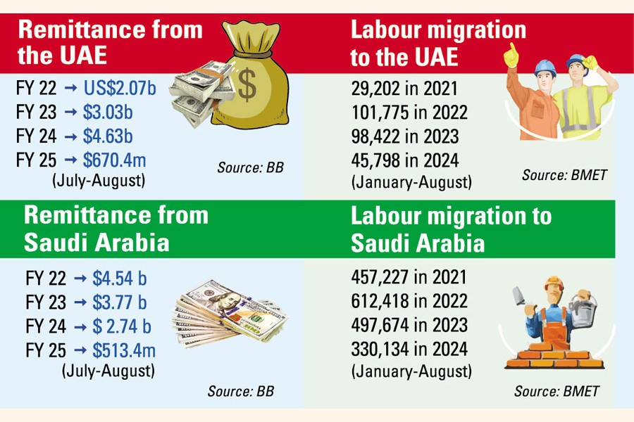 Remittance inflow from the UAE has topped the list of the central bank's top 10 source countries since fiscal year (FY) 24. The highest remittance volume came from that destination in July and August too.