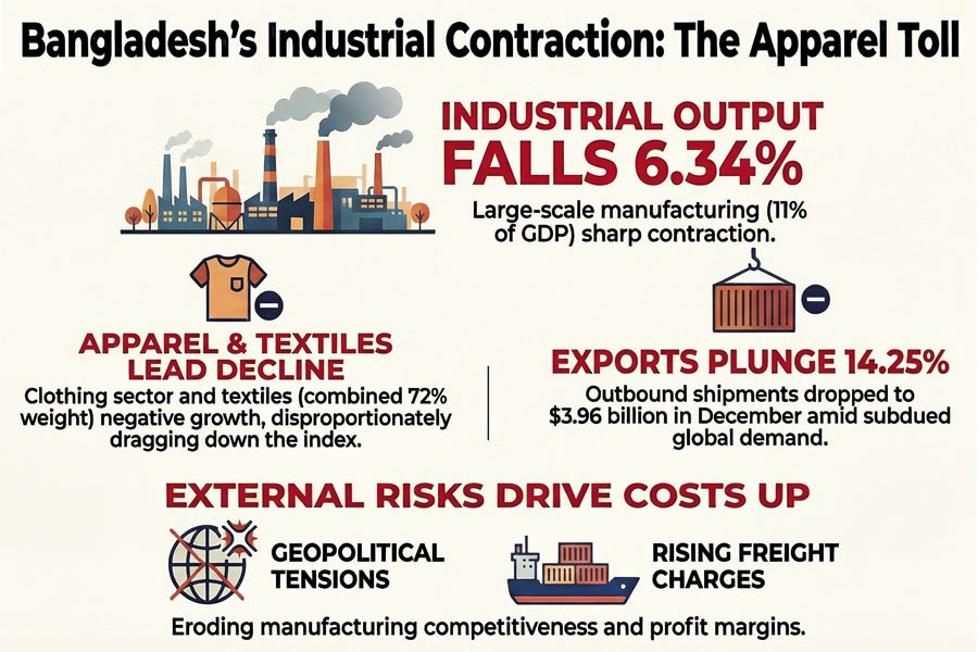 Bangladesh's outbound shipments fell 14.25 per cent year-on-year to $3.96b in December 2025, reflecting subdued global demand, elevated production costs, and heightened geopolitical tensions.