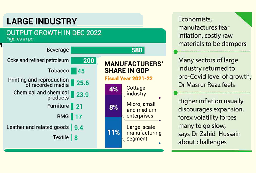 Bangladesh’s large-scale manufacturing sector grew 13.7 per cent in December in a rebound from the global pandemic-led slump while upper-class food supplements, refined petroleum and tobacco topped the growth flowchart.