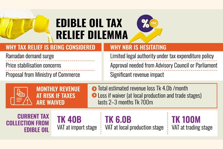 The National Board of Revenue (NBR) is in a dilemma over offering a fresh tax benefit on import of edible oils considering revenue impact.