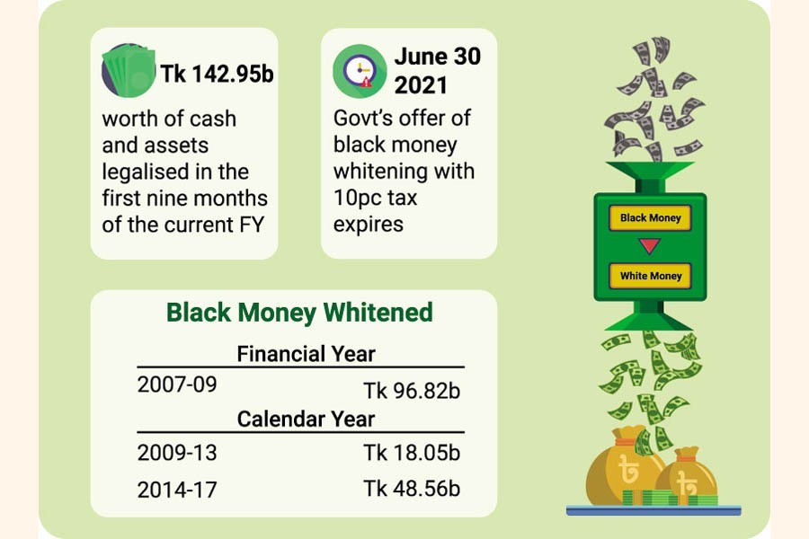 Of them, a total of 9,693 people legalised Tk 138.60 billion mainly in cash, fixed deposit receipts, saving certificates and assets. They have paid Tk 13.90 billion taxes against the disclosure.