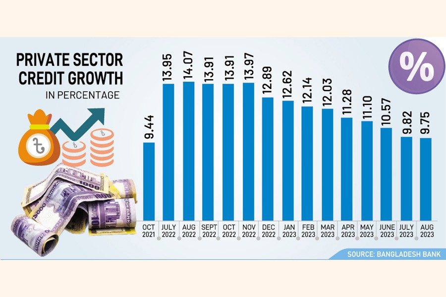 Private-sector credit growth slowed to 9.75 per cent in August, down from 10.57 per cent in July and 11.56 per cent a year ago, according to the latest data of the Bangladesh Bank.