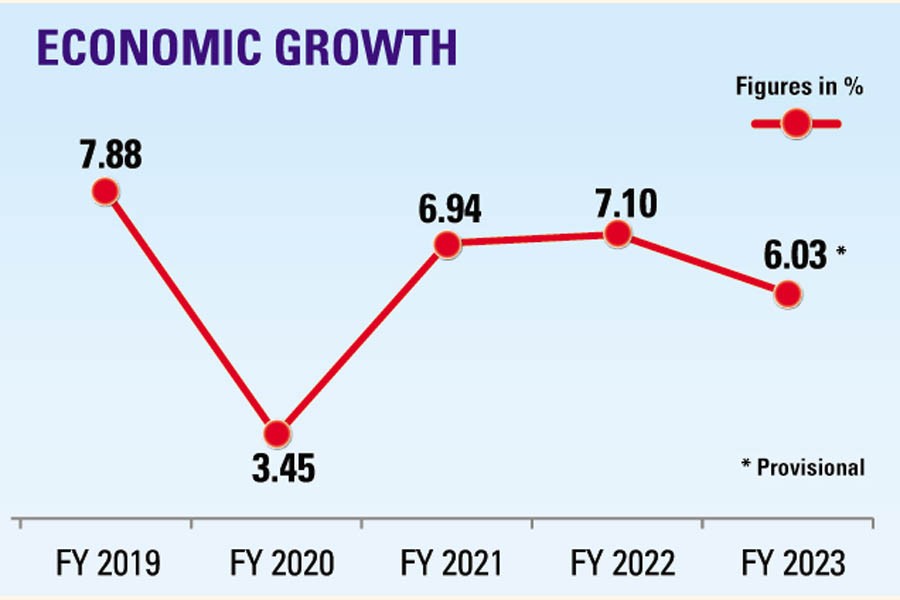 Bangladesh’s economic growth rate is estimated to drop to 6.03 per cent in the current fiscal year (FY), 2022-23, as the industrial sector’s growth plunged, official estimation showed on Thursday.