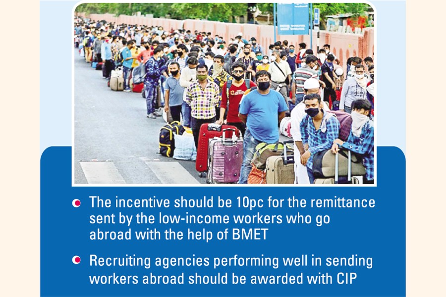 He also said the incentive should be 10 per cent for the remittance sent only by low-income workers who are going abroad with the help of Bureau of Manpower Employment and Training (BMET).