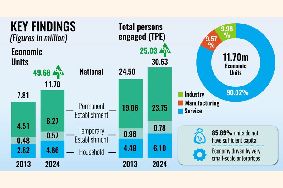 While the total number of economic units has surged to over 11.70 million from 7.82 million in 2013, the manufacturing sector's share has notably contracted, the report revealed by the Bangladesh Bureau of Statistics (BBS) on Tuesday said.