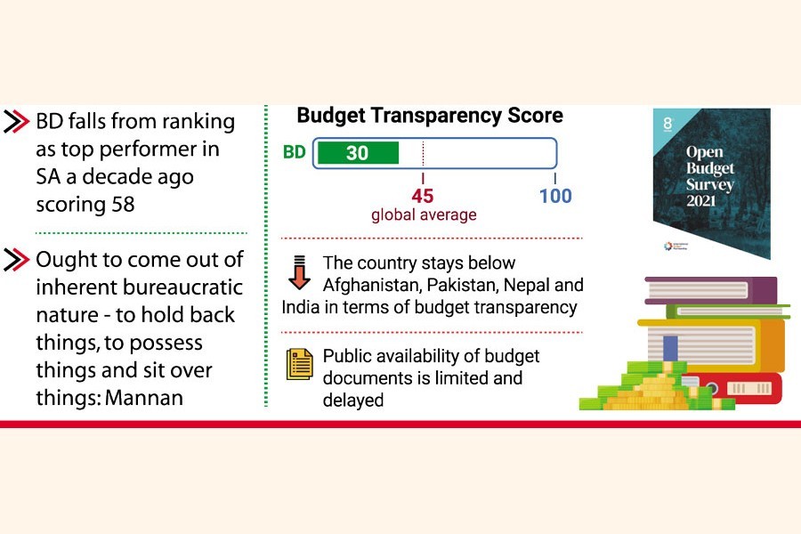 In the 8th edition of Open Budget Survey (OBS), 2021, sponsored by the Washington-based International Budget Partnership (IBP), Bangladesh scored only 30 out of 100, far below the global average of 45.