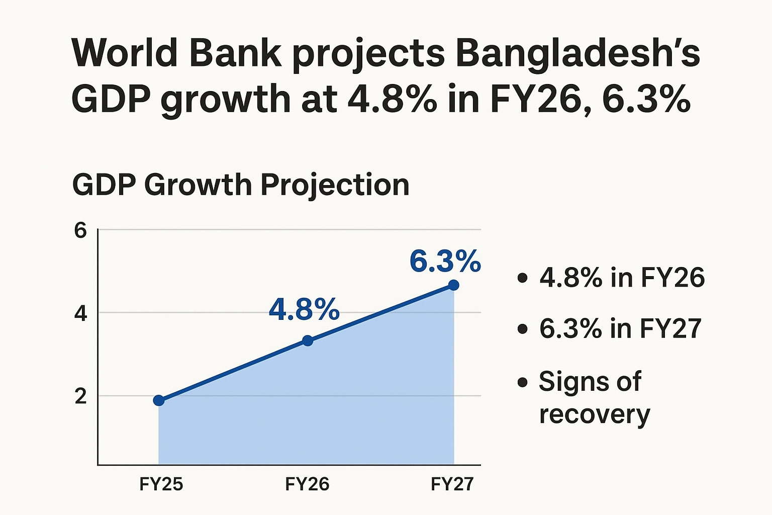 The World Bank has projected Bangladesh’s real GDP growth to reach 4.8 per cent in the current fiscal year (FY26), before accelerating to 6.3 per cent in FY27, supported by signs of economic recovery and easing external pressures.