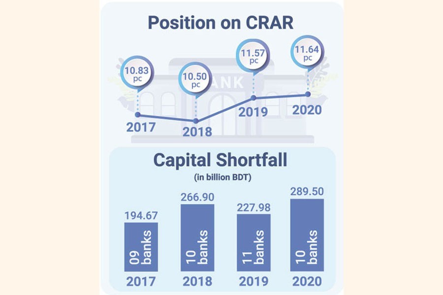 However, 10 banks out of the total 59 witnessed a total capital shortfall of Tk 289.50 billion in 2020 despite a falling trend in default loans.