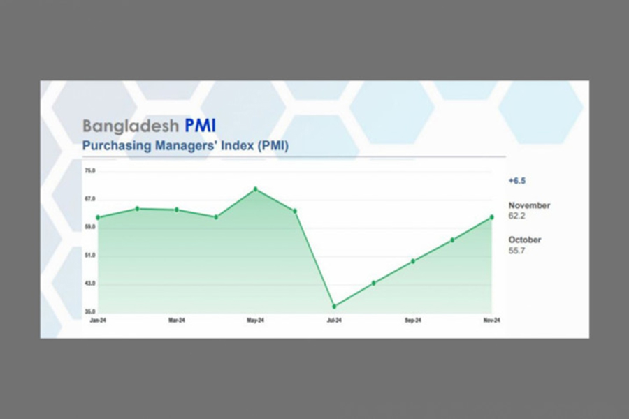 Bangladesh’s economy is gaining momentum, with the Purchasing Managers' Index (PMI) for November 2024 reaching a robust 62.2, a 6.5-point increase from October. The report, jointly released on Sunday by the Metropolitan Chamber of Commerce and Industry (MCCI), Dhaka, and Policy Exchange Bangladesh (PEB), highlights significant growth across key sectors.