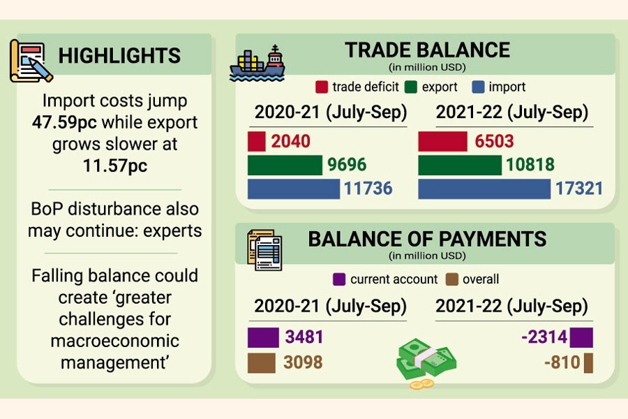 The Bangladesh Bank (BB) data show that import expenses jumped 47.59 per cent while export earnings recorded an 11.57-per cent growth in Q1 of FY '22.