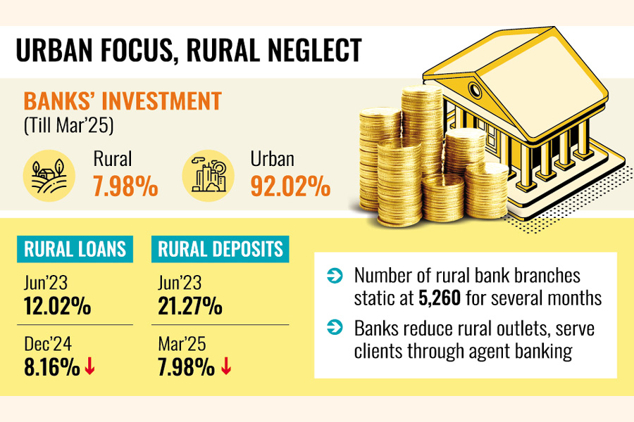 According to the Bangladesh Bank (BB) data, banks altogether had invested Tk 17.13 trillion in various sectors across Bangladesh up to March 2025, with the share of rural areas being 7.98 per cent or Tk 1.37 trillion.