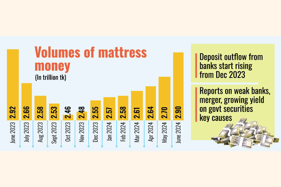 A stark fact is that the volume of mattress money or currency outside the banks ballooned to Tk 2.90 trillion by the end of June 2024 from Tk 2.70 billion recorded in the previous month, according to latest statistics of Bangladesh Bank (BB).