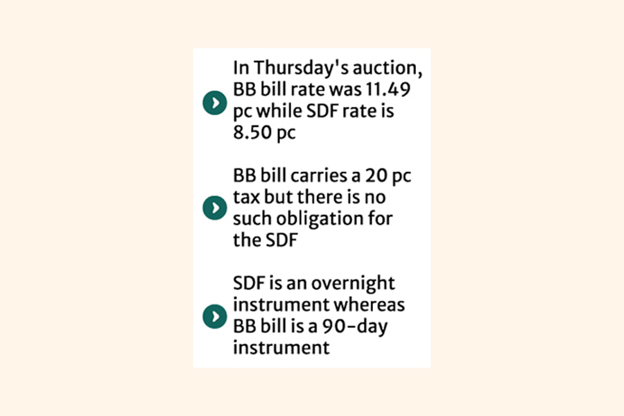 Requesting anonymity, a BB official said the SDF is an overnight instrument while BB bill is a 90-day money-sterilising instrument.