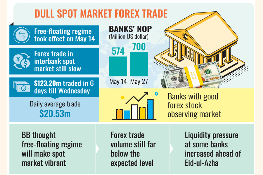Complying with a condition of the International Monetary Fund (IMF) given as part of its $4.70 billion lending package, the Bangladesh Bank left the exchange rate on the market with an undisclosed band on May 14 this year, hoping this will make the interbank forex spot market vibrant.