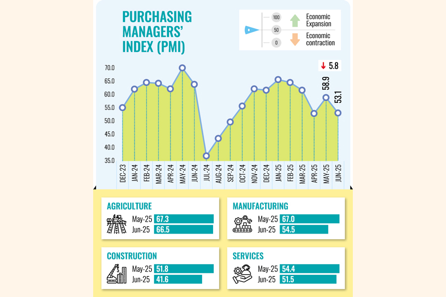 Bangladesh's Purchasing Managers' Index (PMI) fell sharply by 5.8 points in June 2025, indication a 'notable' slowdown in its industrial and business activities, according to data released on Monday.