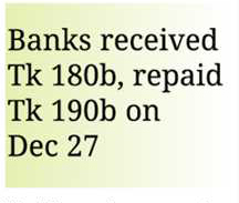 For example, the official said, the banks received liquidity supports amounting to Tk 180 billion on December 27, 2023 when they repaid Tk 190 billion on maturity of their previous cash feeding.