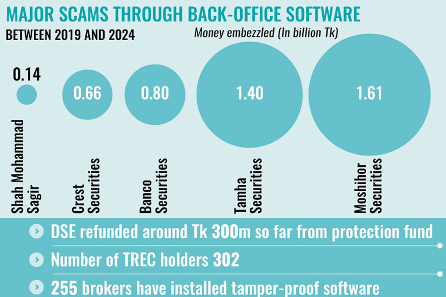 Major scams so far involved Crest Securities, Dawn Securities, Tamha Securities, Banco Securities, and Shah Mohammad Sagir & Company which siphoned off as much as Tk 3 billion altogether between 2019 and 2021.
