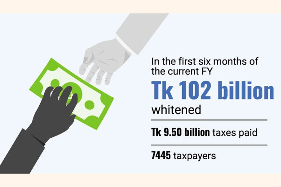In the first six months of the current FY, some 7,445 taxpayers whitened Tk 102 billion by paying a record amount--- Tk 9.50 billion--- in taxes.