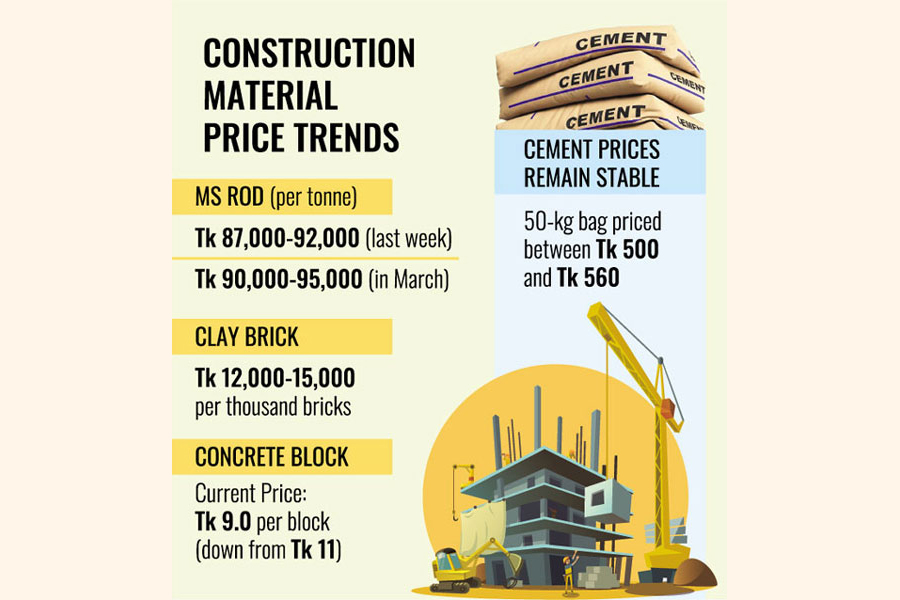 Prices of some key construction materials have sagged slightly in recent times mainly due to poor demand amid economic uncertainties, compounded by monsoon floods, following the downfall of the Hasina-led government.