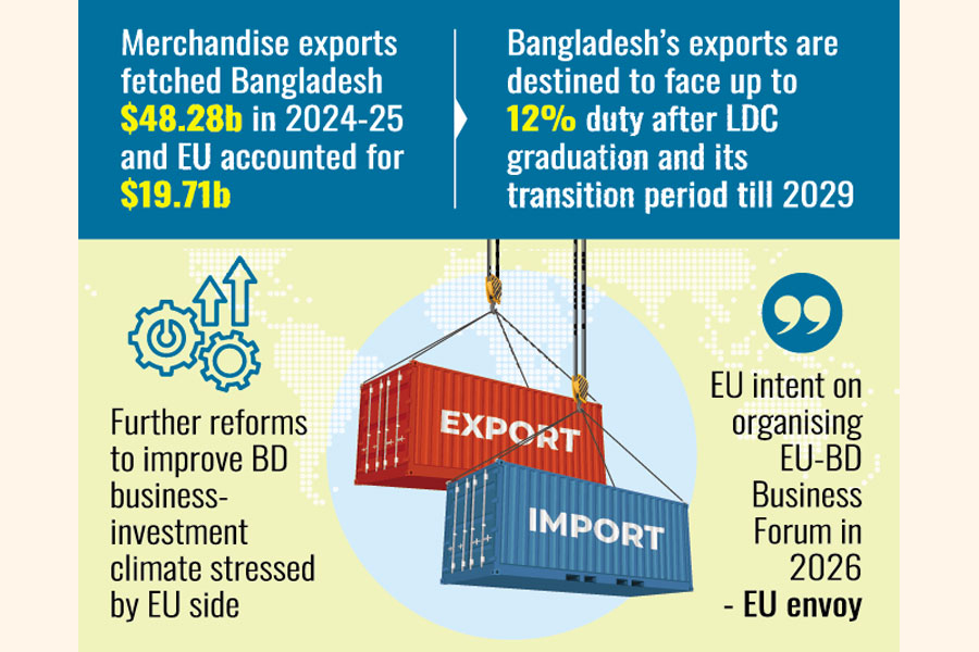 He underlines EU's strong interest in bringing European investment and technology to Bangladesh -- an important market with a population of nearly 200 million. He also expresses EU readiness to organise an EU-Bangladesh Business Forum in 2026.