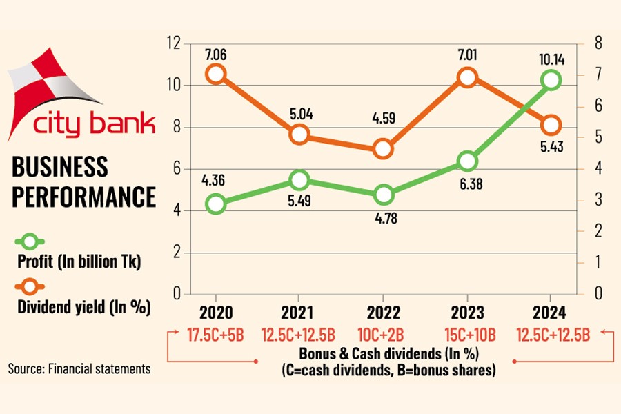 City Bank's annual profit surpassed Tk 10 billion in 2024 for the first time since its inception in 1983, securing a remarkable 59 per cent year-on-year growth driven by substantial income from investments in government securities.