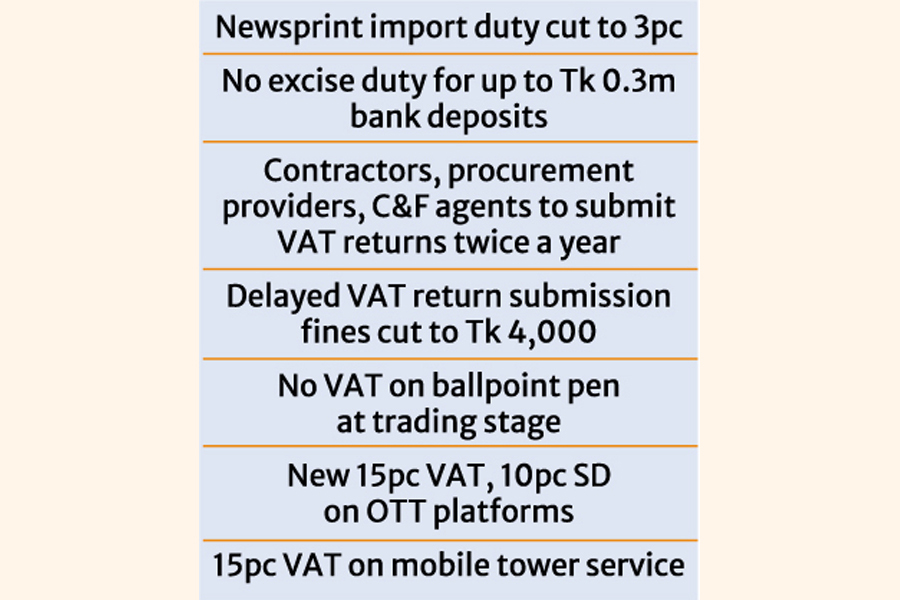 Also, fines on delay in submission of VAT returns have been lowered to Tk 4,000 instead of exiting 60,000 per year.