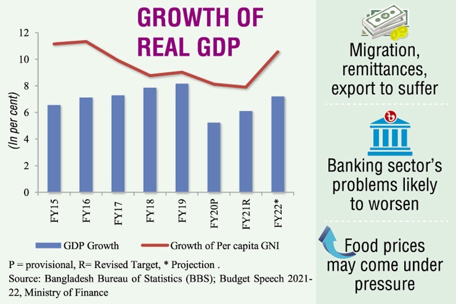 The central bank, however, said the ongoing easy monetary and expansionary fiscal policies along with implementation of stimulus packages may contribute to achieving the targeted real GDP (gross domestic product) growth with a tolerable inflation rate in the fiscal year (FY) 2020-21.