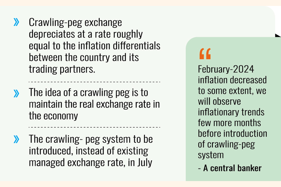 People familiar with the matter at the central bank of Bangladesh told the FE that the crawling- peg system would be introduced instead of the existing managed exchange rate in July.