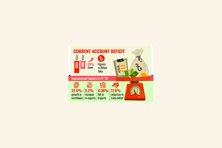 Bangladesh's current- account deficit under the balance of payments narrowed to Tk 698.81 billion at the end of FY24, a significant improvement from the Tk 1.085-trillion deficit recorded in the previous financial year.