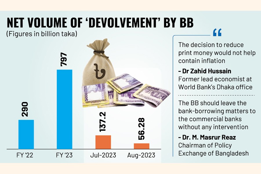 But starting from this ongoing financial year (FY'2024), the pace of high-powered money's share slowed significantly as the volume of devolvement-driven fund push was Tk 137.20 billion in July 2023.