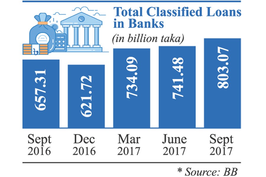 According to the latest statistics from the central bank, the amount of NPLs, officially termed classified loans, rose to Tk 803.07 billion at the end of last September from Tk 657.31 billion a year back.