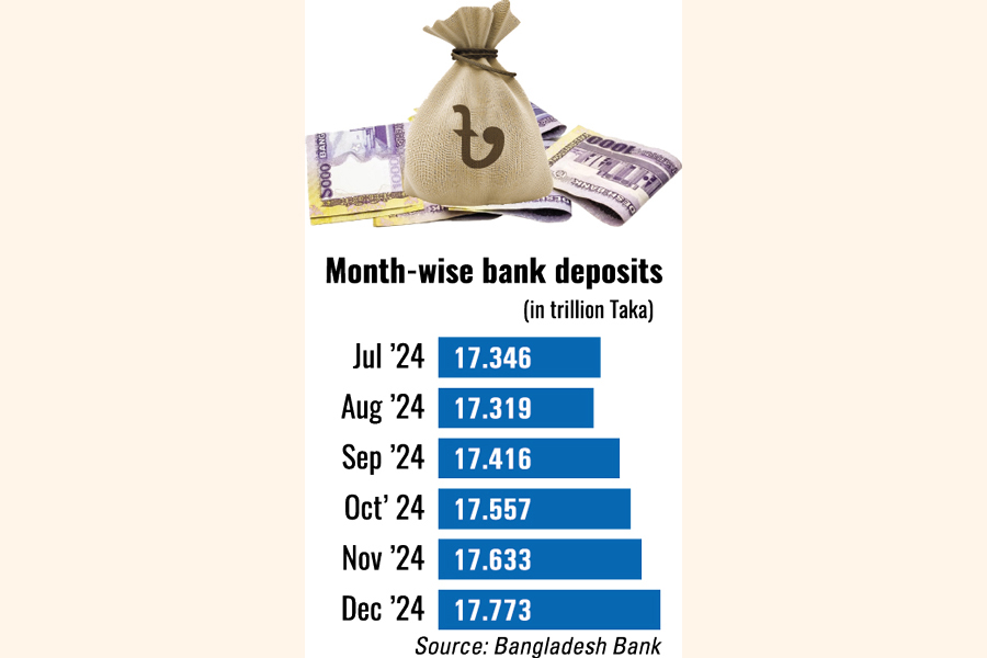 According to the latest report from Bangladesh Bank, the aggregate deposits with the banks rose by Tk 345.17 billion to over Tk 17.77 trillion by the end of December 2024.