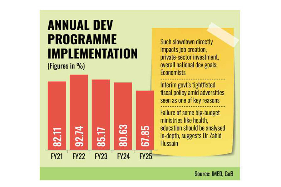 Latest official statistics show the ADP-implementation rate in the fiscal year (FY) 2024-25 recorded a 20-year low, raising concerns about the country's economic development and job generation.