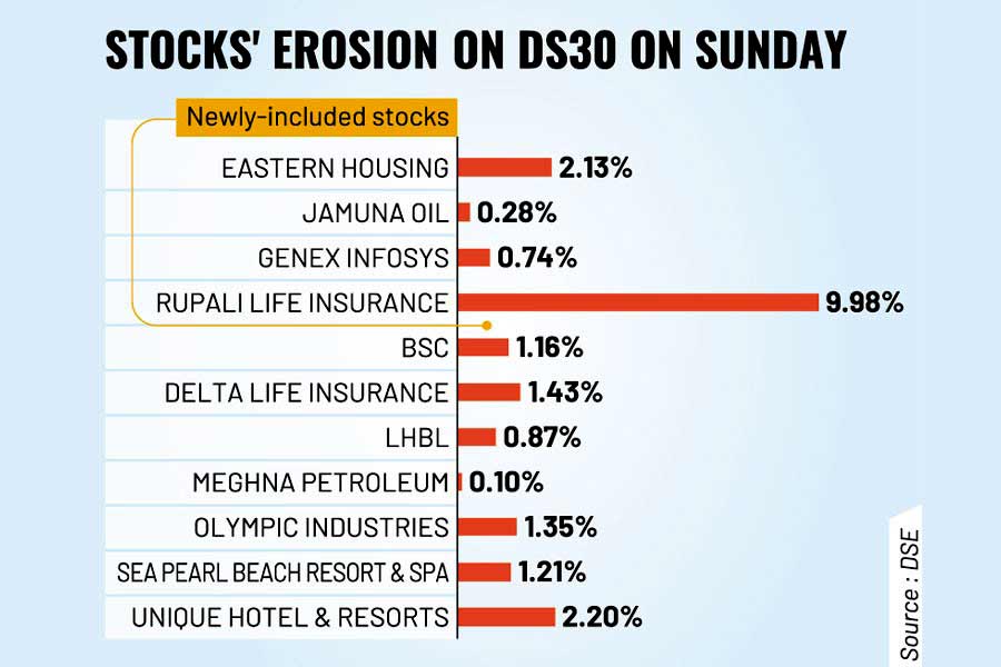 Another three newly-included companies -- Eastern Housing, Genex Infosys, and Jamuna Oil - saw price erosions by 0.28 per cent to 2.13 per cent on the DSE.