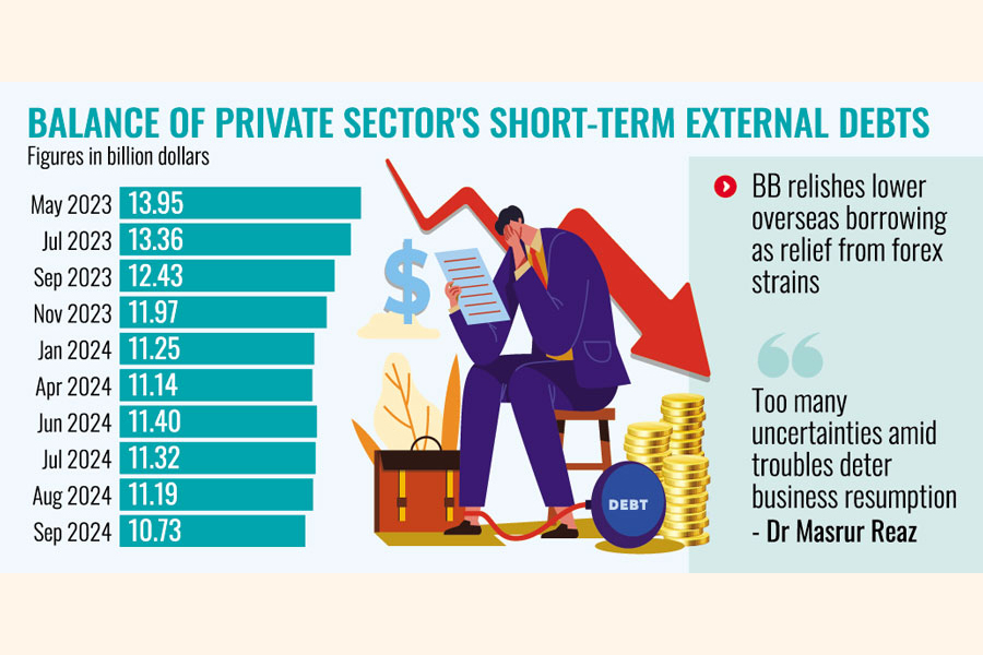 External corporate borrowing squeezes with short-term overseas debt stock having dropped to $10.73 billion in latest count as entrepreneurs postpone business expansion in wait for a feel-good ambiance after recent unrest.