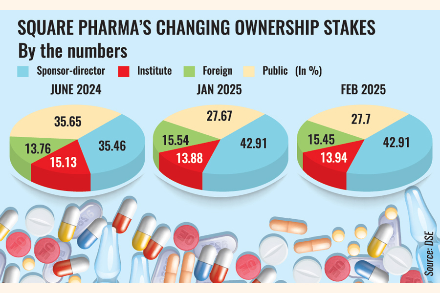 Sponsors of the largest drug manufacturer had already bought more than 66 million shares between June and December last year, taking their stakes to 42.91 per cent by the end of 2024 from 35.46 per cent in June last year. The value of those shares was more than Tk 14 billion, considering the average market price during the time.