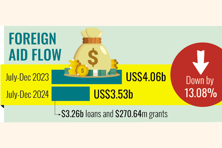 Foreign-aid disbursement to Bangladesh dropped US$3.53 billion in the first half of the current fiscal year as all its development partners ramped down bankrolling its uplift recipe, official statistics show.