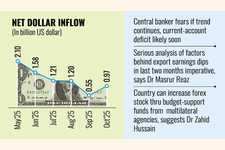 According to Bangladesh Bank (BB) statistics, earnings of foreign currencies amounted to $6.30 billion in the form of remittance and exports in the just-past October. But settlement of import orders ate up $5.41 billion. The volume of excess inflow now reached a mere $0.97 billion in the last month.