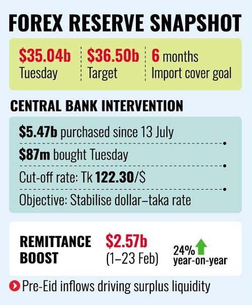 Officials said the interventions are aimed at stabilising the dollar-taka exchange rate while gradually rebuilding reserve buffers to meet global adequacy standards.
