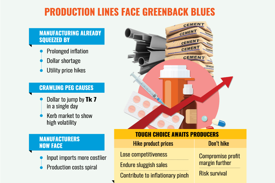 A confluence of factors -- dragging on inflation, a dollar shortage and rising utility prices -- had already punctured the country's manufacturing spirit. The recent record surge in the dollar, jumping Tk 7 in a single day, has only compounded these difficulties for manufacturers who rely heavily on imported raw materials.