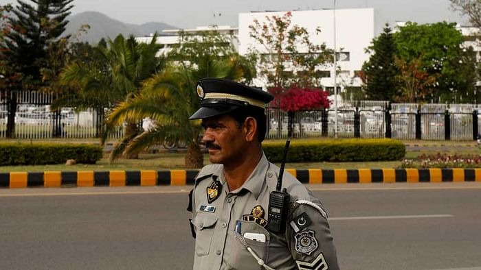 A police officer stands guard with the Parliament House building in the background, in Islamabad, Pakistan Apr 11, 2022. |REUTERS