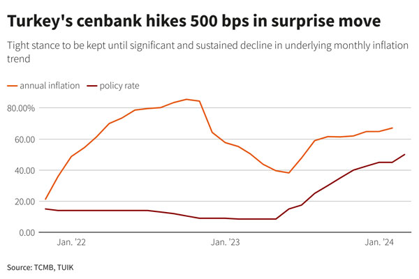 Turkey’s central bank unexpectedly raised interest rates by 500 basis points to 50 per cent on Thursday, citing a deteriorating inflation outlook and pledged to tighten further if significant and persistent deterioration in inflation is foreseen.