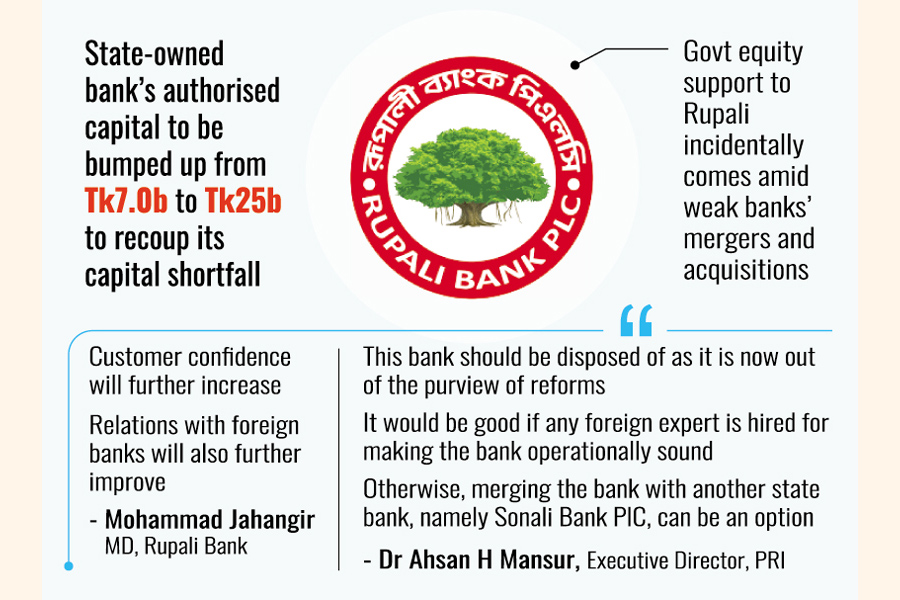Capital-deficient state-owned Rupali Bank's authorised capital is being bumped up from Tk 7.0 billion to Tk 25 billion to bolster its financial base and enhance clientele confidence, sources said.
