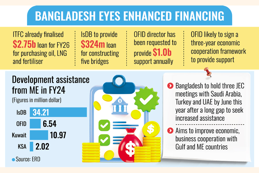 He said they had already requested ME donors, including the Islamic Development Bank (IsDB), Saudi Arabia, Abu Dhabi Fund for Development, UAE, OPEC Fund for International Development (OFID), Kuwait, Qatar, and Turkey, to enhance their cooperation with Bangladesh.