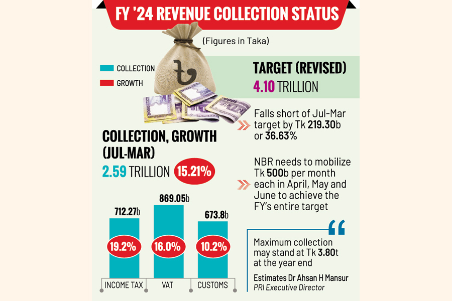 The July-March tax-revenue collection came to Tk 2.59 trillion, leaving a shortfall of Tk 219.30 billion. The pared-down annual target is Tk 4.10 trillion for the 2023-24 fiscal.