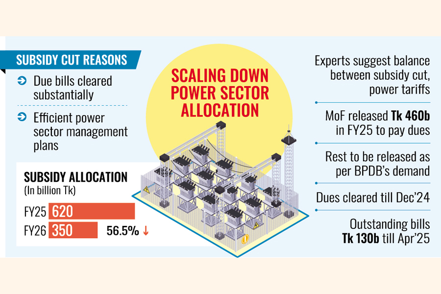 In the national budget for FY 2025-26, scheduled to be placed in parliament on June 2, the allocation for power subsidy would be Tk 350 billion, about 56.5 per cent of Tk 620 billion revised allocation for the outgoing fiscal year, officials said on Tuesday.